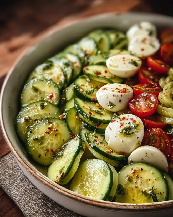 This is the salad I make when I want something cold and refreshing but still kind of creamy and satisfying. The cucumber gives you that crunch, and the mozzarella makes it feel like a real meal instead of a side dish. I love it with cherry tomatoes if I have them, but it’s great even with just cucumbers and cheese.