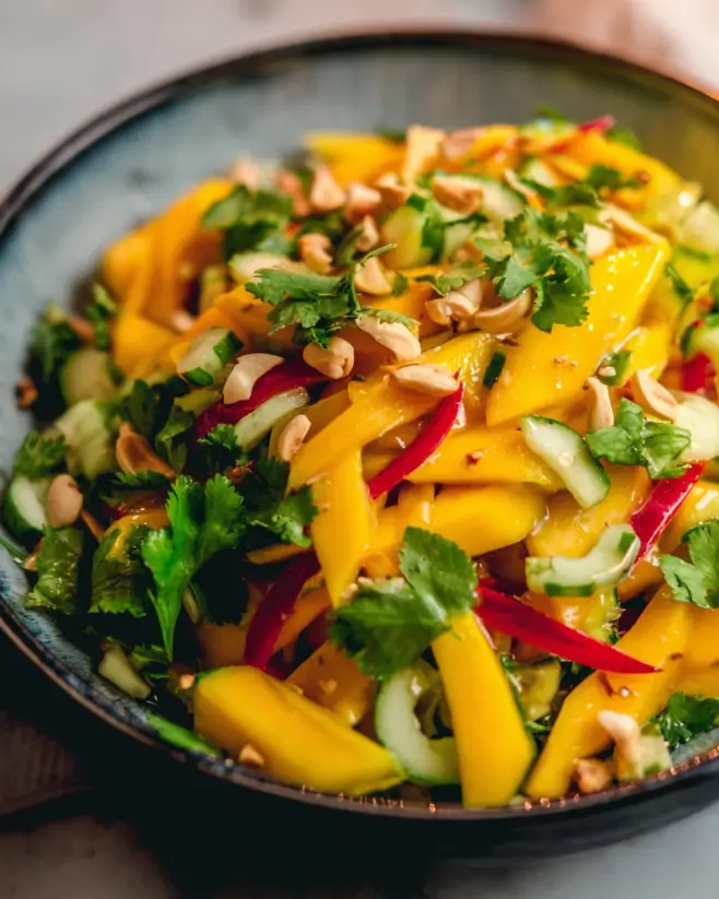 What makes it work: shredded mango, thin sliced cucumber, carrot ribbons, and a handful of chopped peanuts or cashews for crunch. For the dressing, I mix lime juice, a tiny bit of honey, fish sauce (optional but authentic), and chili flakes.