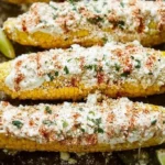 Delicious corn on the cob dressed with a creamy mayo-crema mix, Cotija cheese, and spices, delivering a burst of flavor in a quick and easy recipe.