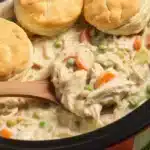 Store leftovers in the fridge up to 4 days. Reheat gently on the stove with a splash of broth or milk to loosen it back to creamy. Freeze the filling without the biscuits up to 3 months. Thaw overnight and warm slowly, then top with fresh-baked biscuits for best texture.