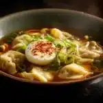 Calm and steady. You cook eggs first so they have time to cool. Then you build a simple broth with chicken stock, soy, and sesame oil. The dumplings go straight into the simmering broth no thawing, no fuss. Add the noodles last so they don’t get soggy.