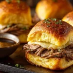 These little sandwiches are perfect for parties, easy to make, and full of flavor, featuring layers of roast beef, caramelized onions, and melted cheese served with au jus for dipping.
