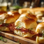 The light hit the counter like it knew something small and warm would live there. Ham and Cheese Sliders slipped into my mind because they look like tiny golden houses soft, shiny tops, cheese oozing at the seams. I liked the quick promise of color: pale ham, pale Swiss, the butter’s glossy sheen. And texture soft bun, thin ham, that slight crisp on top. It felt like an easy, focused thing to make when the day was quiet.