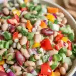 A colorful and flavorful Mediterranean Bean Salad with chickpeas, cannellini, and kidney beans, perfect for hot days and potlucks.